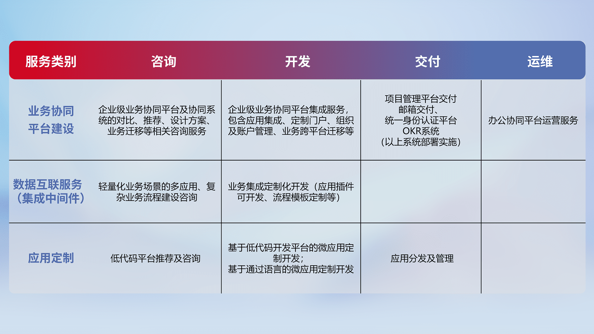 针对钉钉、、、、企微、、、、IDaas等平台级产品提供产品的规划、、、、方案、、、交付、、、、定制化开发等服务,,,,实现如统一协同办公、、智能客户服务、、、混合会议管理、、智能数据查询、、等业务场景,,,实现数字化转型。。。。